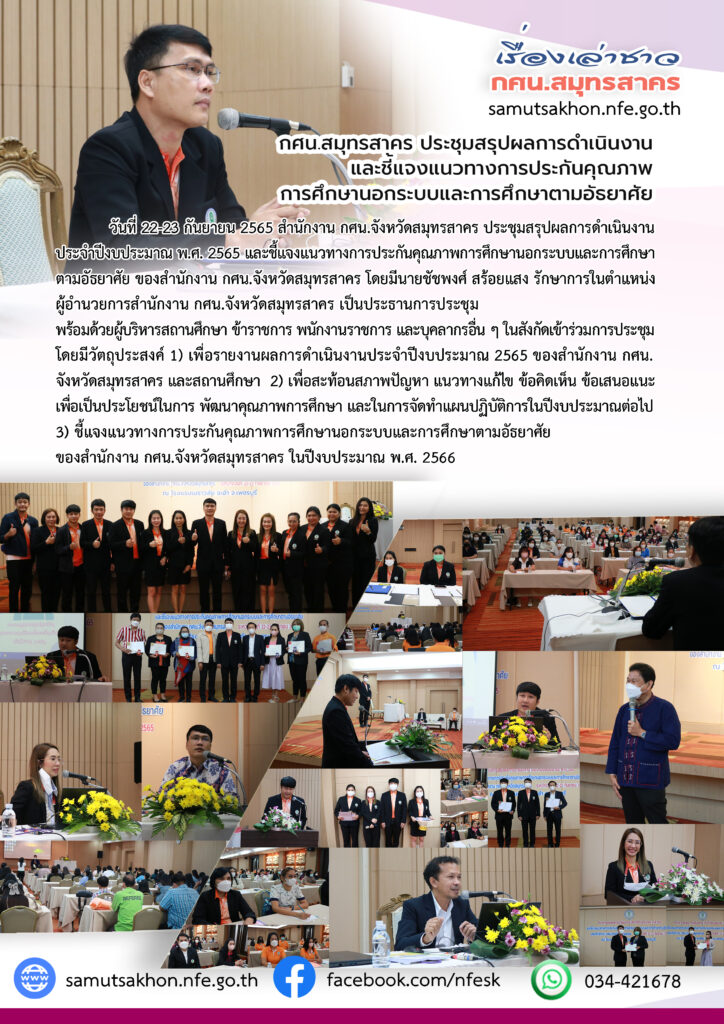 วันที่ 22-23 กันยายน 2565 สำนักงาน กศน.จังหวัดสมุทรสาคร จัดประชุมสรุปผลการดำเนินงาน ประจำปีงบประมาณ พ.ศ. 2565 และชี้แจงแนวทางการประกันคุณภาพการศึกษานอกระบบและการศึกษาตามอัธยาศัย ของสำนักงาน กศน.จังหวัดสมุทรสาคร โดยมีนายชัชพงศ์ สร้อยแสง รักษาการในตำแหน่งผู้อำนวยการสำนักงาน กศน.จังหวัดสมุทรสาคร